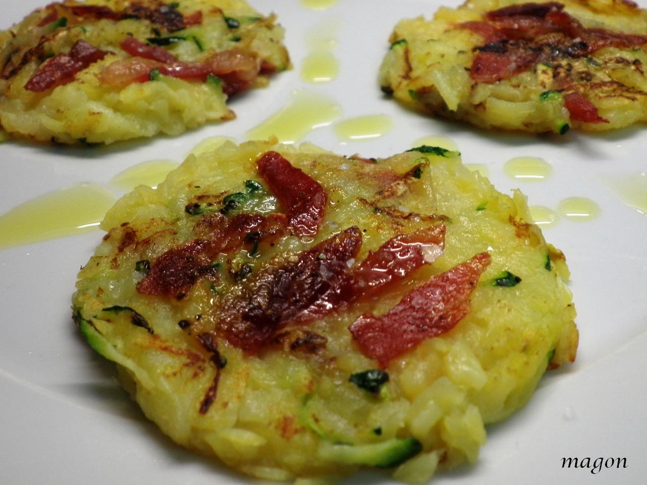 Con la ayuda de un aro de emplatar preparar unas tortas con la patata, el calabacín y el jamón, poner en la sartén y dejar hacer a fuego medio-alto, dándole un toque de pimienta negra recién molida al acabar, emplatar y poner unas gotas de aceite de oliva virgen extra en crudo por encima.