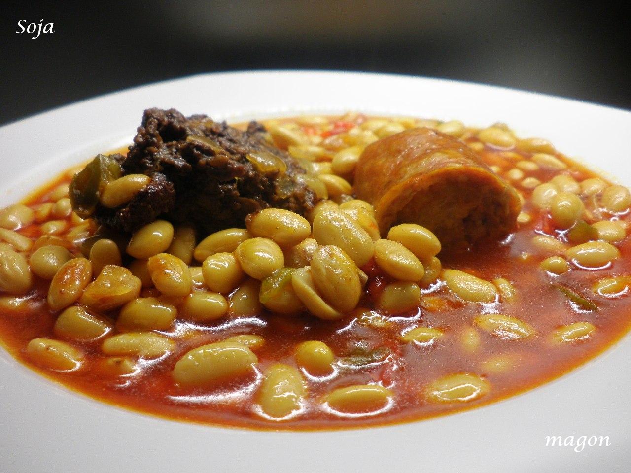 Poner la soja en la cubeta, lavada y escurrida, cubrir justo con agua, poner el puerro y la hoja de laurel, la pizca de cominos y salar, partir los chorizos en cuatro y la morcilla y para dentro también, cerrar la olla y poner 15 minutos en manual.