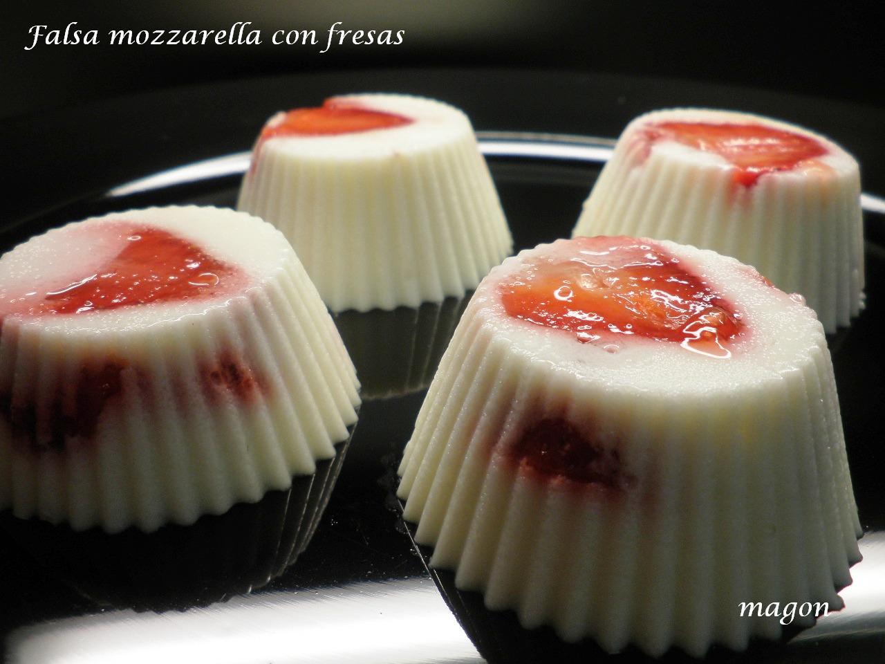 En los moldes elegidos, yo he usado unos para muffins de silicona, poner unos trocitos de fresa azucarada y verter hasta llenar el molde con lo que tenemos en la cubeta, en un par de horas estará cuajado.