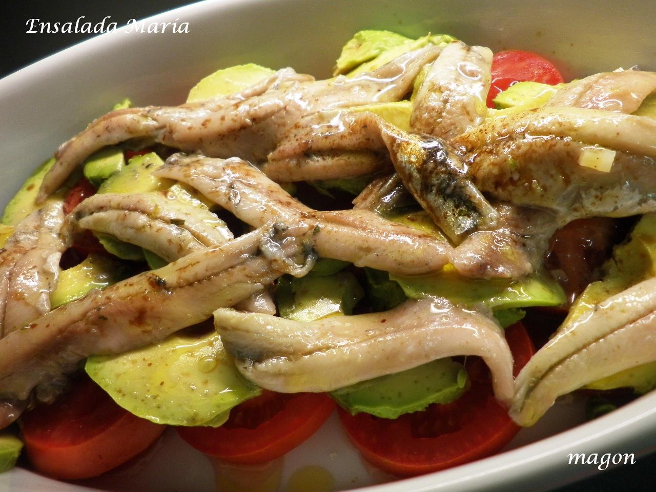 Poner en la base de una fuente baja, los tomates cortados en rodajas, encima los aguacates en lonchas, salpimentar y sobre ellos los boquerones, pulverizar con vinagre de módena.