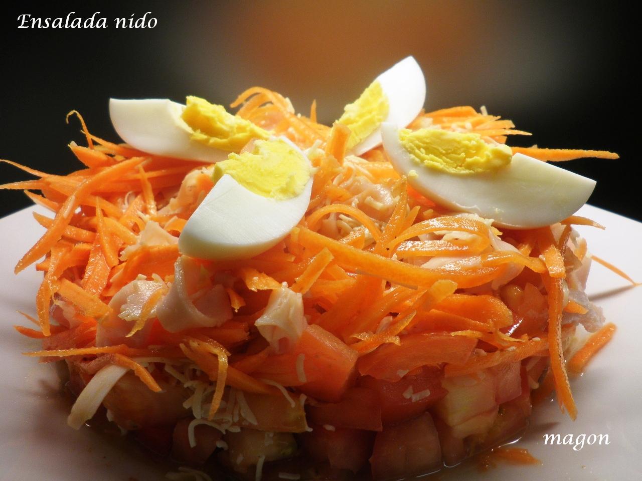 Nos gustan mucho las ensaladas y aprovechando que viene el calorcito preparé esta para la cena de ayer, fue un éxito de crítica y público, así que me acosté ¡feliz! El nombre se me ocurrió al ver como quedaba en el plato me pareció un nido ¿Y a vosotros?