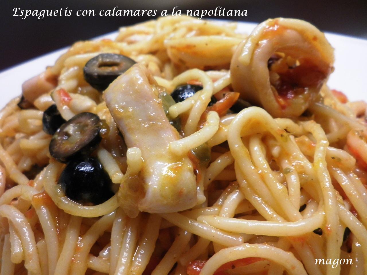 En otro recipiente dorar los calamares con un poco de aceite, salpimentar y añadirle el tomate frito y un vaso de vino blanco, así como las aceitunas negras, las alcaparras , los piñones y el orégano, dejar al fuego 5 minutos, poner entonces los espaguetis y poner el agua suficiente para que se hagan al dente y queden secos, es preferible quedarse cortos y añadir agua si lo necesita que pasarse. Dejar hervir el tiempo que indique la pasta y servir caliente.