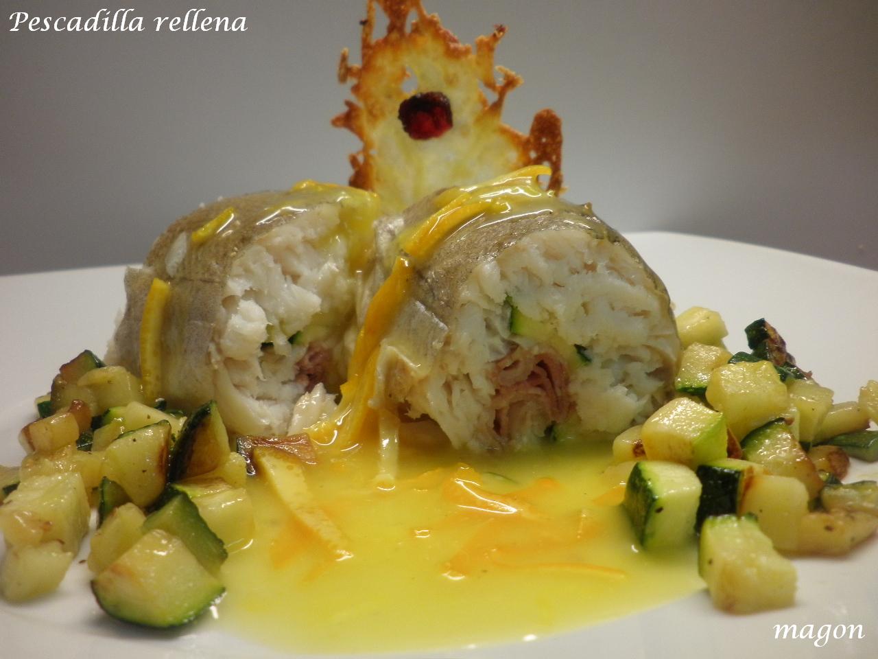 Para el montaje del plato, poner unas rodajas de la merluza rellena, napar con la salsa, acompañar con el calabacín salteado y el queso al horno.