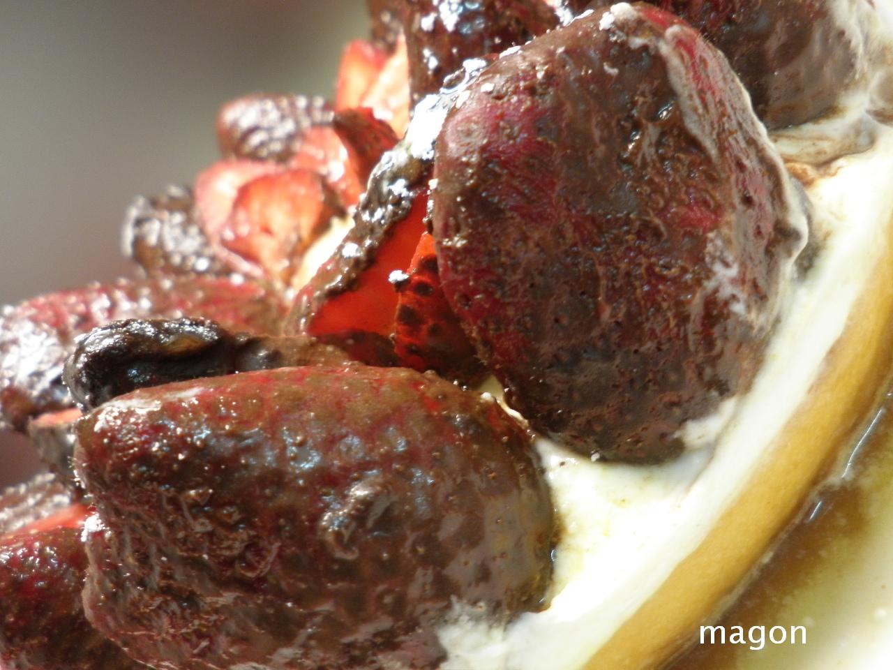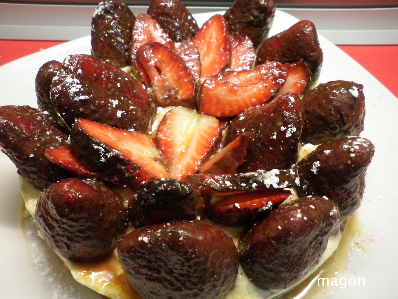 Desmoldar el bizcocho base, poner en el plato donde se va a servir. Poner alrededor un aro para tartas, bañar con el almíbar, reservar un poco, esperar que empape bien y cubrir con la nata bien fría, poner encima las fresas bañadas de chocolate y regar con el almíbar reservado y espolvorear con azúcar glass si se quiere.
