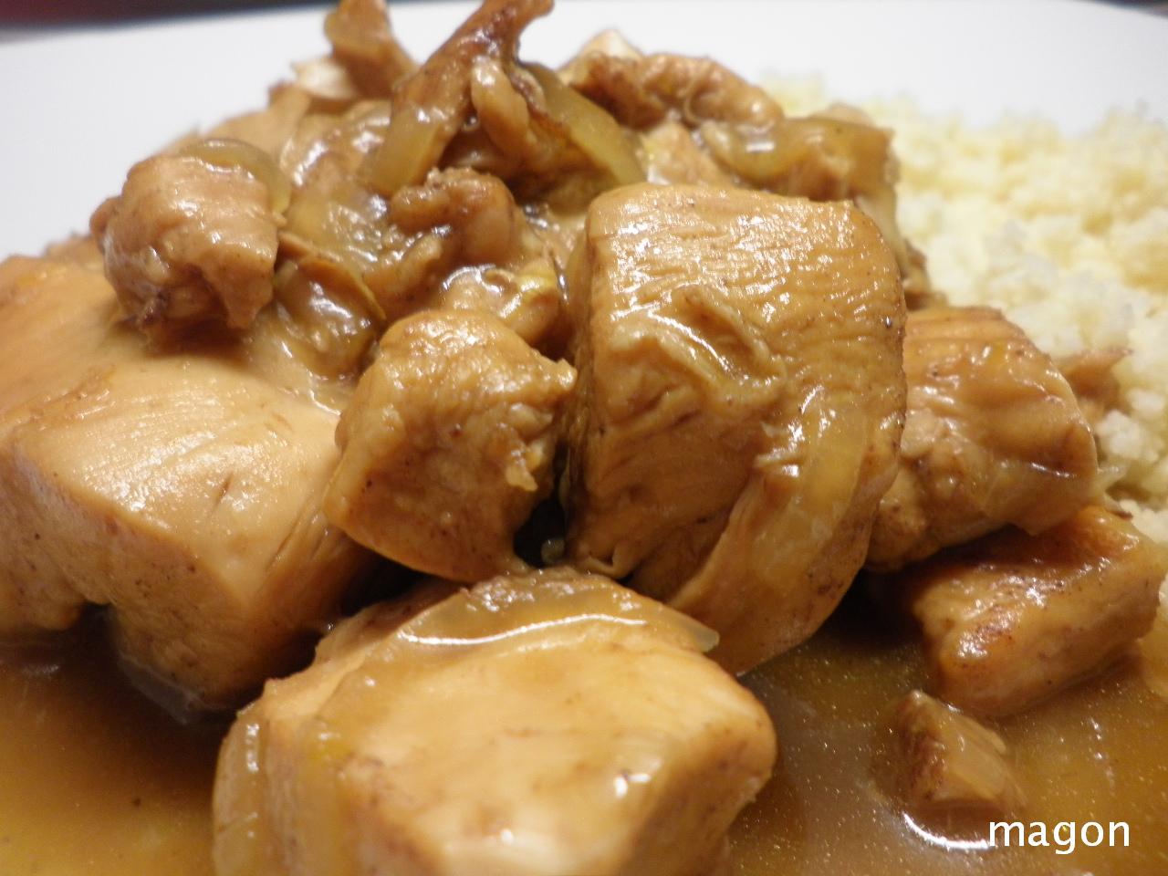 Dorar el pollo en un fondo de aceite, cuando tome color añadir la cebolla cortada en aros finos remover y dejar 2 o tres minutos hasta que empiece a transparentar, añadir el zumo de naranja, el jengibre, el garam masala y las pasas, dejar cocer hasta que la carne esté hecha.