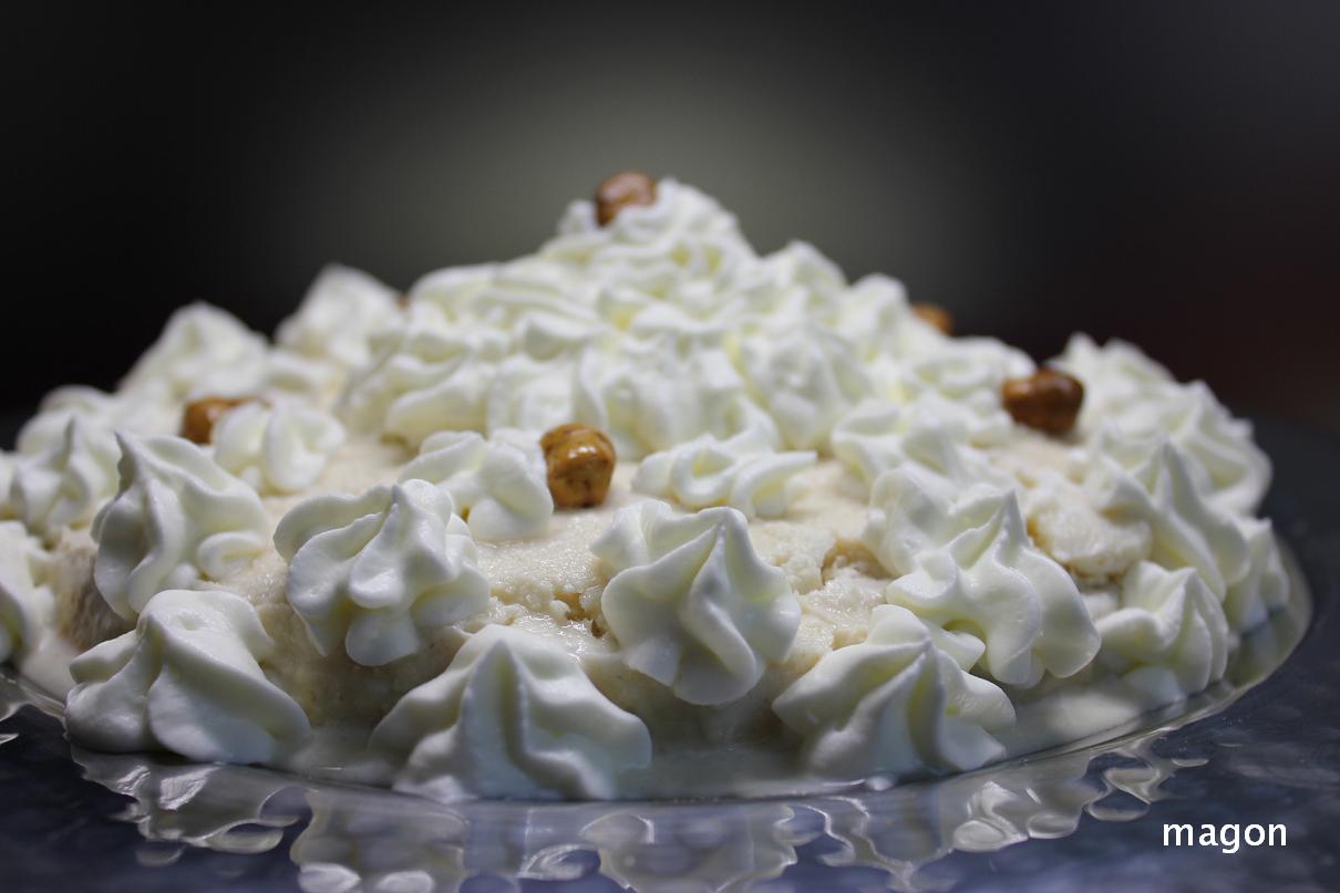 Montar la nata con azúcar al gusto y adornar la tarta con ella una vez quitemos el molde o aro que hemos usado.